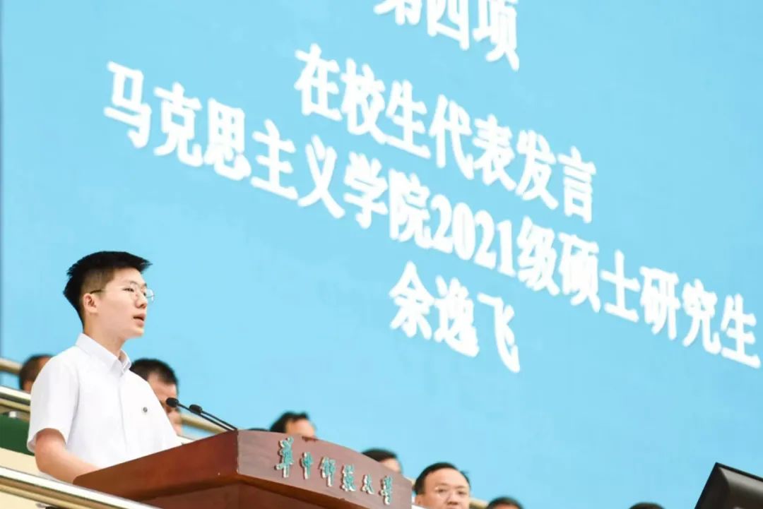勤學善思、篤行實干、心中有夢,是在校生代表、馬克思主義學院碩士研究生余逸飛眼中華師學子的模樣。他勉勵全體新生“行而不輟、砥礪奮斗,努力做乘風而起的鯤鵬,在民族復興的偉大征程中跑出青春最好的成績。”