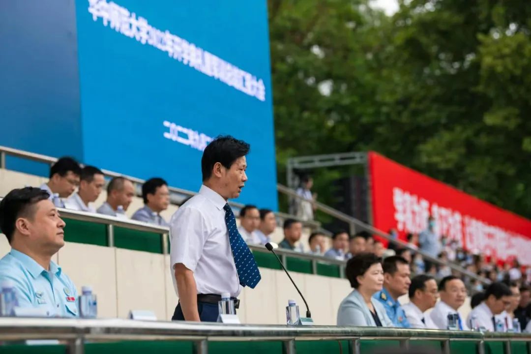 華大在線訊(記者 鄒媛奕 李嘉瑤)桂子山上乘夢啟航,書寫青春最美模樣。9月20日,我校2022年開學典禮暨軍訓總結匯報大會在佑銘體育場舉行。中國人民解放軍空軍預警學院副院長代明,校領導趙凌云、郝芳華、查道林、彭南生、夏立新、陳厚豐、任友洲、李鴻飛、陳迪明出席。典禮由校黨委副書記陳迪明主持。