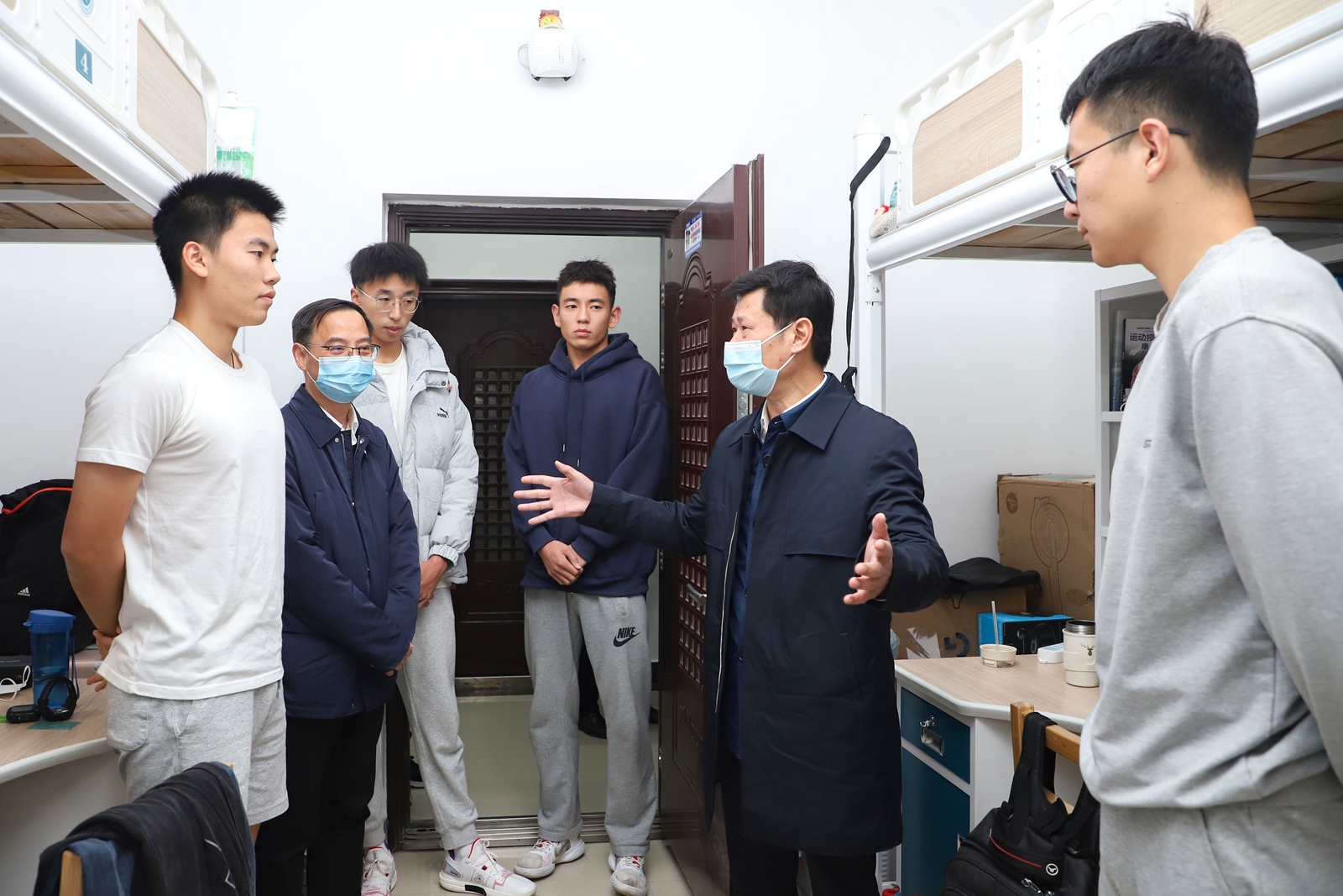 趙凌云一行還來到南湖4棟學(xué)生宿舍,與同學(xué)們進行交流。他詳細詢問了大家的學(xué)習(xí)生活情況,叮囑同學(xué)們在疫情防控期間,要做好自身健康第一責(zé)任人。學(xué)校會積極幫助大家解決學(xué)習(xí)和生活上遇到的問題,全力保障師生健康安全和校園平穩(wěn)有序。