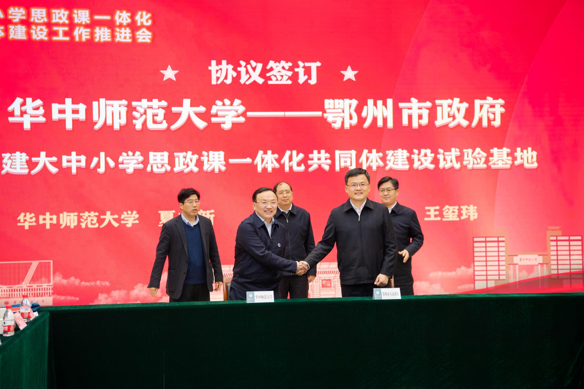 夏立新介紹,華中師范大學積極推進思政課一體化建設,堅持政治統領、改革創新、同頻共振、示范引領,探索構建一體化機制,深耕一體化課程建設,推進一體化資源共享,打造一體化建設品牌,牽頭申報并獲批了教育部大中小學思政課一體化共同體(湖北省)。作為教育部大中小學思政課一體化共同體(湖北省)建設牽頭高校,學校將充分發揮教師教育、人文社科、教育數字化等優勢,在數字賦能思政課、校地共建等方面做出特色、辦成精品、形成品牌,為推動思政課內涵式發展,構建具有湖北特色的教育發展新格局作出新的更大貢獻。會上,教育部大中小學思政課一體化共同體(湖北省)建設正式揭幕。夏立新和王璽瑋代表雙方簽訂華中師范大學——鄂州市政府共建大中小學思政課一體化共同體建設試驗基地框架協議。鄂州市、武漢大學、華中科技大學、宜昌市教育局、紅安縣第一中學等五家單位作發言交流。