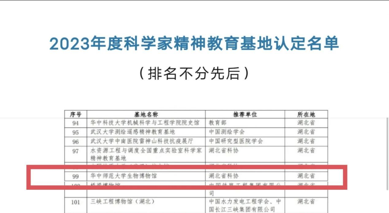 華大在線訊(通訊員 鄧淑文 黃悅)5月30日,中國科協、教育部、科技部、國務院國資委、中國科學院、中國工程院、國防科工局聯合發布2023年度科學家精神教育基地認定名單。經過初評、終評和公示等程序,華中師范大學生物博物館成功入選2023年度科學家精神教育基地。