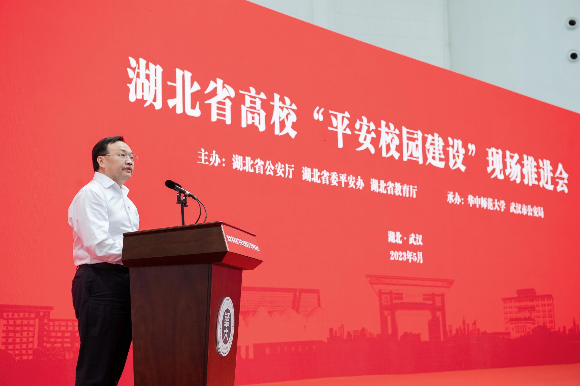 華大在線訊(記者 華軒)近日,全省高校“平安校園建設”現場推進會在我校佑銘體育館舉行。湖北省副省長、公安廳廳長徐文海,省委政法委副書記肖紅梅,省教育廳黨組書記、廳長周靜,省公安廳黨委副書記、副廳長吳德清,武漢市副市長、公安局局長楊彪出席。省直單位、全省高等學校以及市、州、直管市公安局相關負責人參加。校黨委書記夏立新作致辭發言,校長郝芳華作經驗交流。