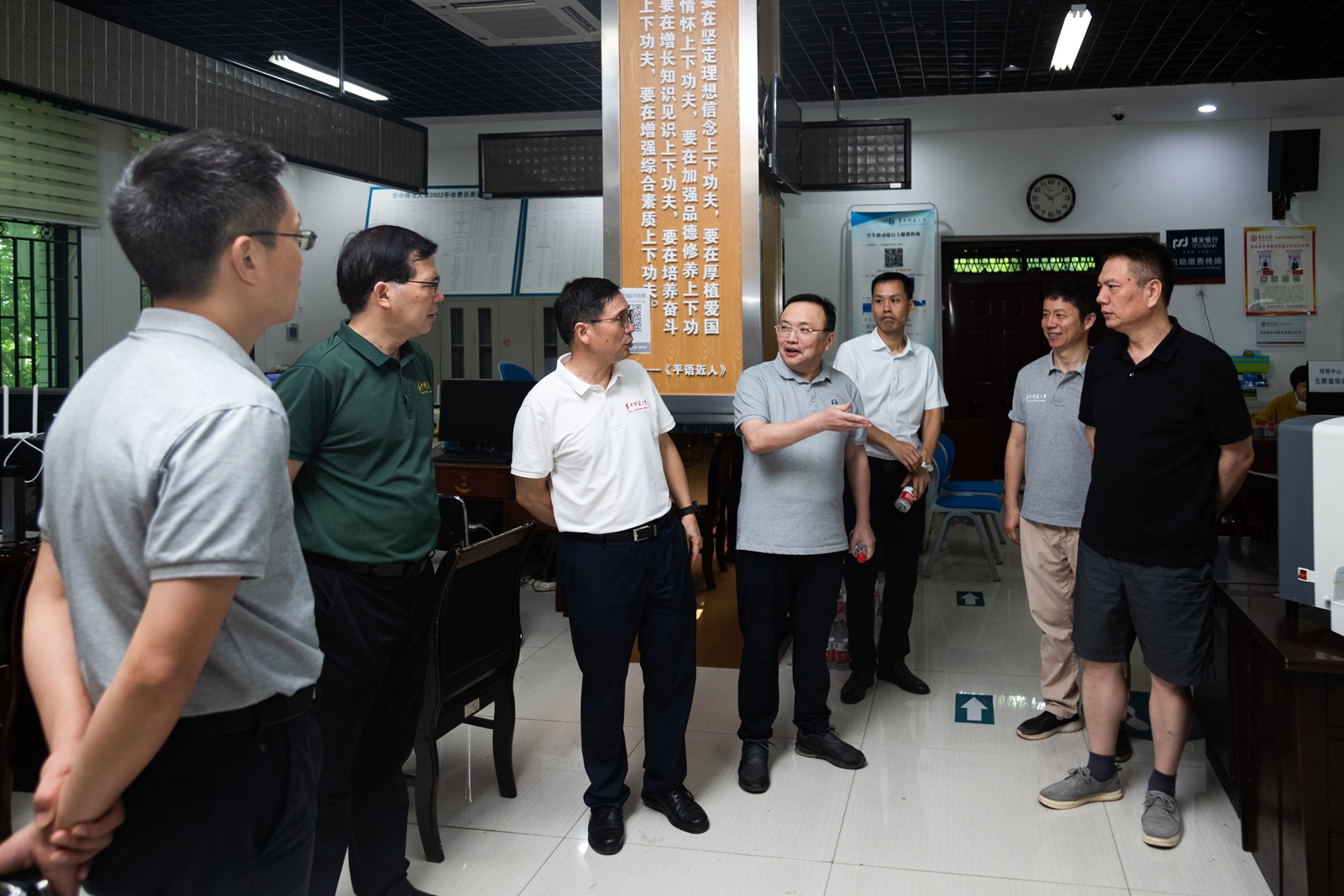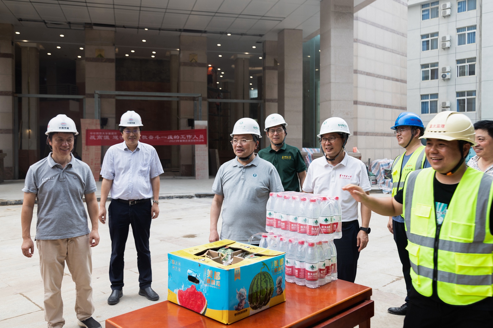 華大在線訊(記者 宋漢濤)炎炎夏日,暑氣蒸騰。連日來,學校師生員工和各工地施工人員不畏酷暑,堅守在教學科研和學校基礎建設第一線。8月14日上午,校黨委書記夏立新、副校長任友洲、校黨委副書記陳迪明帶隊走訪慰問了暑期堅守一線的師生員工和校內工地施工人員,并為大家送上防暑降溫用品。