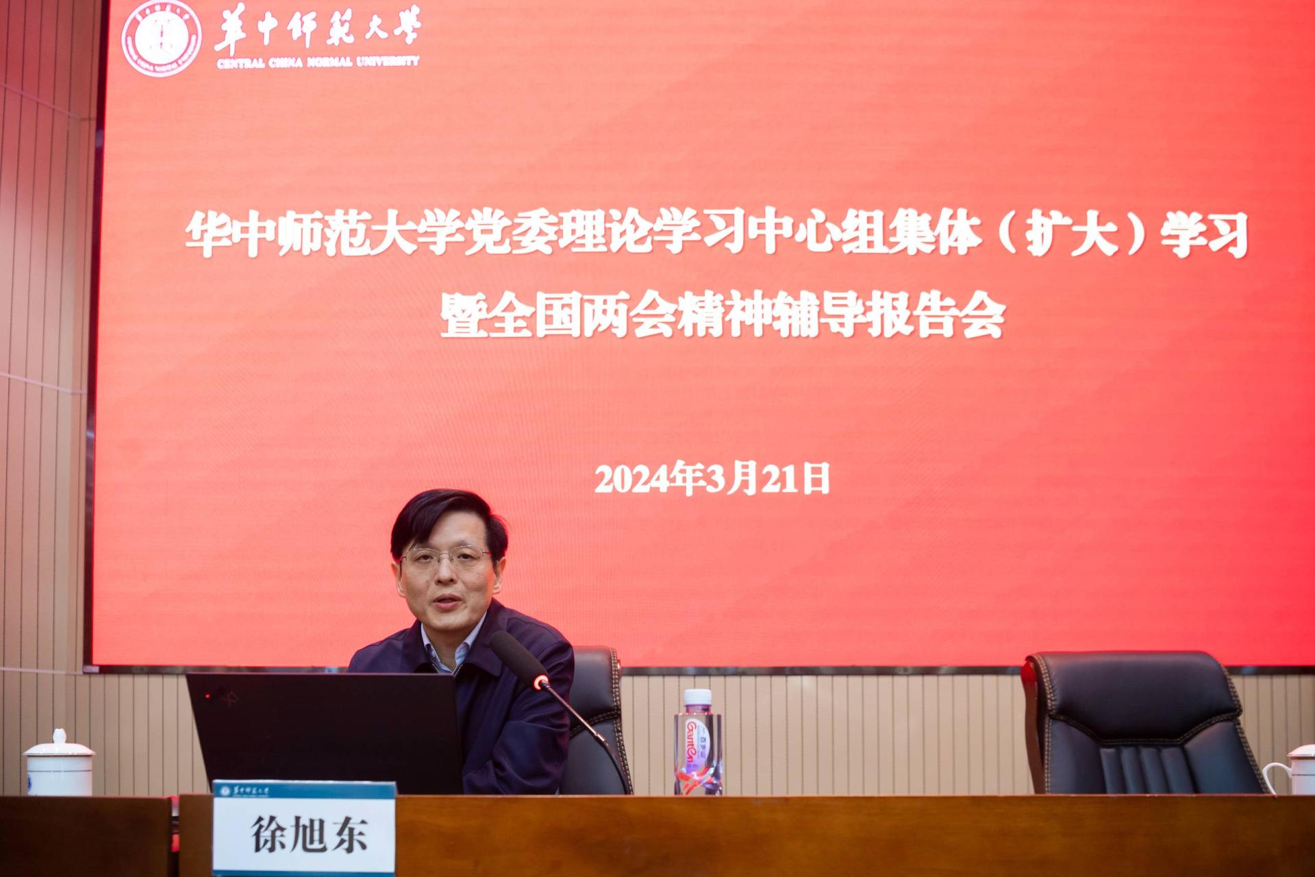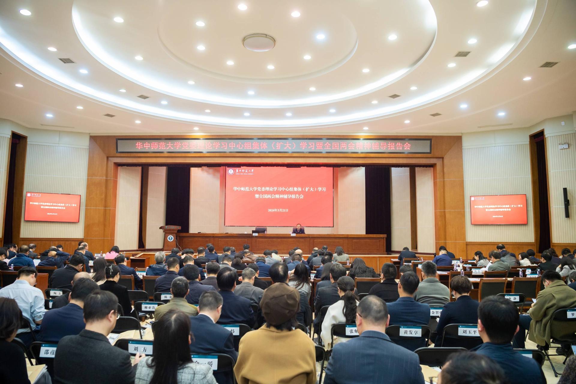 華大在線訊(記者 華軒)3月21日,華中師范大學在科學會堂一樓報告廳舉行校黨委理論學習中心組集體(擴大)學習暨學習貫徹全國兩會精神輔導報告會,深入學習貫徹2024年全國兩會精神。校黨委常委,全體中層干部,各級人大代表和政協委員、各民主黨派基層組織和僑聯負責人,各涉老組織負責人和師生代表參會。會議由校黨委書記夏立新主持。