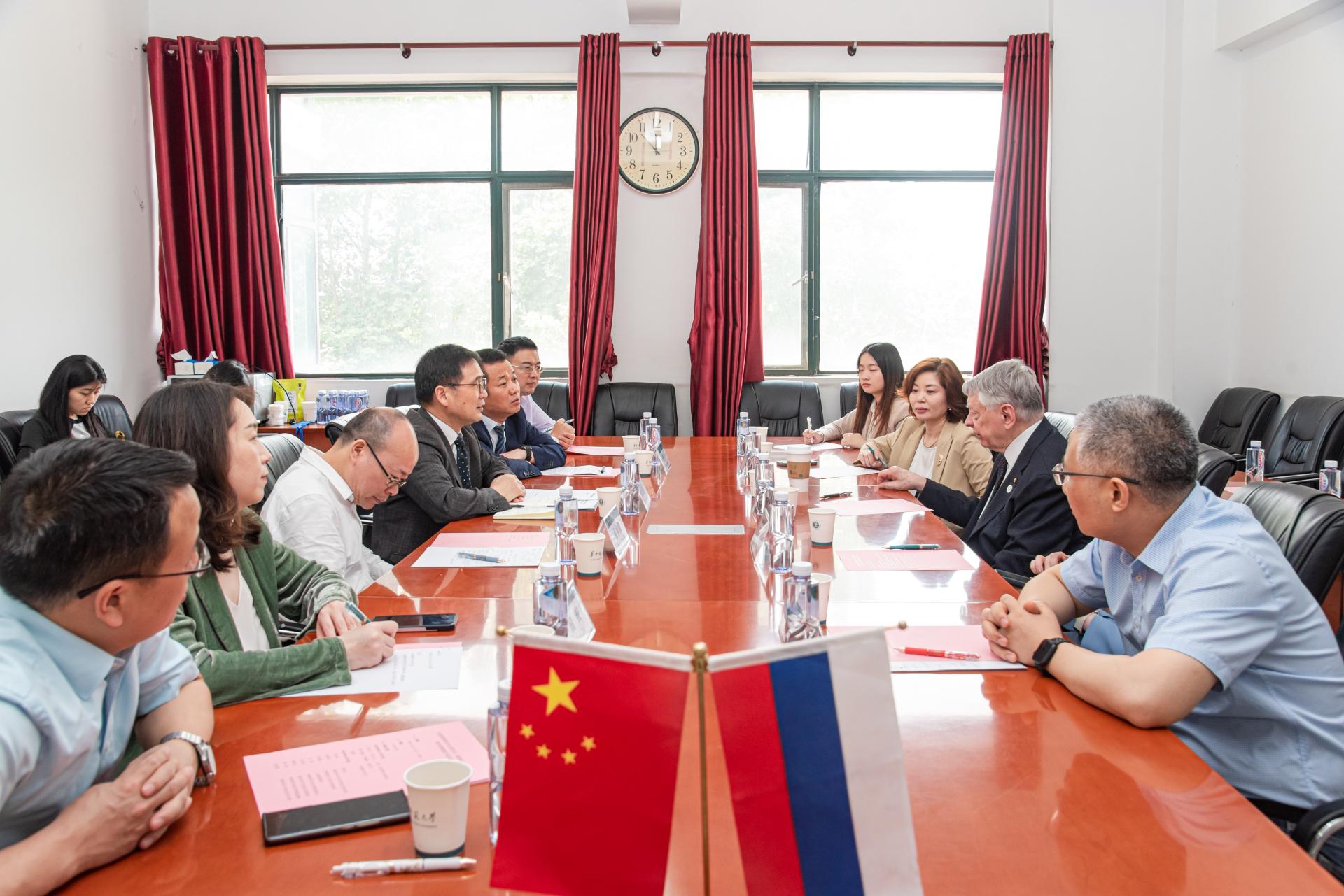 任友洲在致辭中介紹了我校辦學情況以及物理科學與技術學院的優勢專業與重點發展方向,期待兩校未來能在理工科領域開展深入合作,助力我校物理學科發展。西戈夫院士借用孔子名言“千里之行,始于足下”表達了對兩校合作的希望,承諾將積極推進兩校在專家交流、人才培養等多個領域開展務實合作。