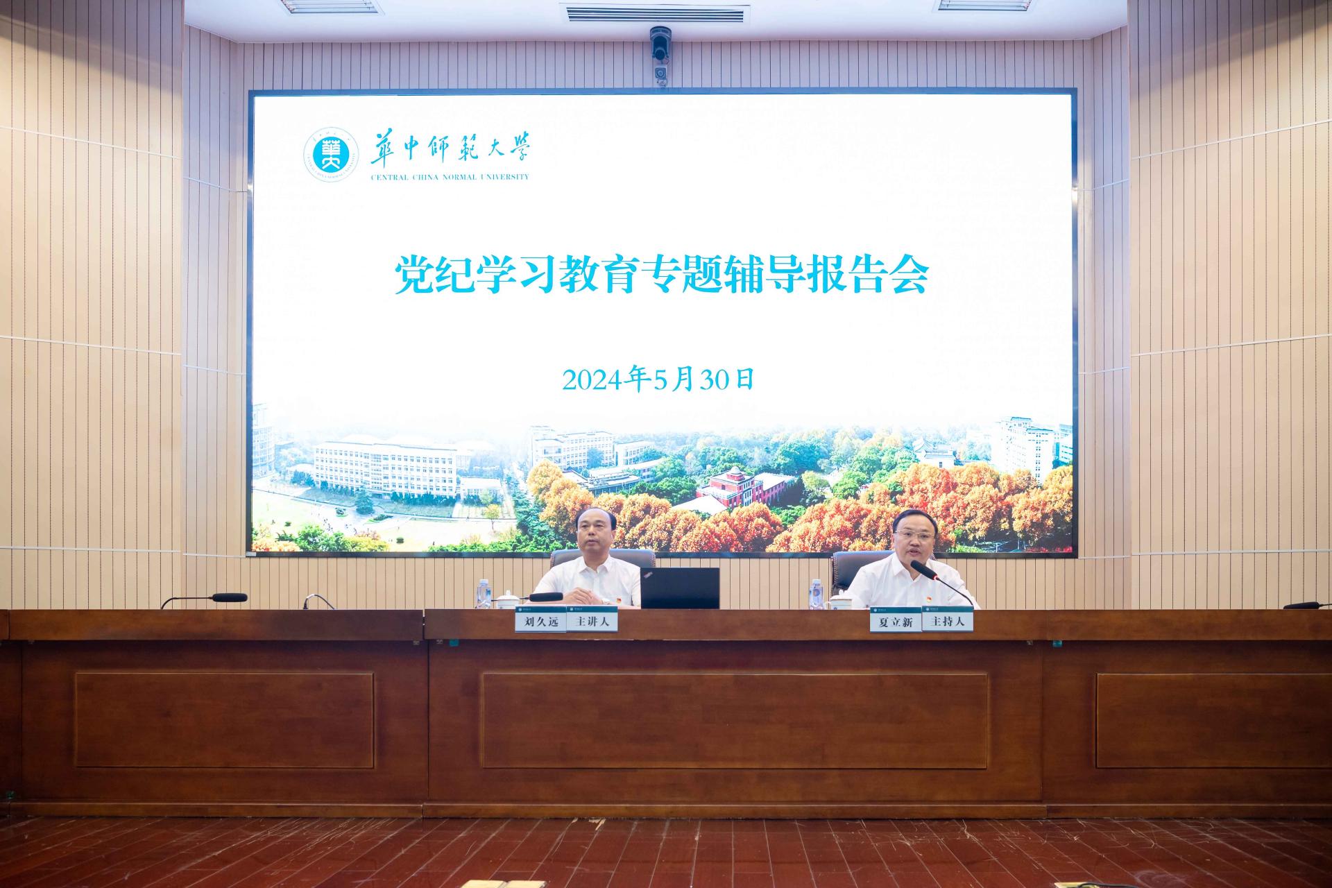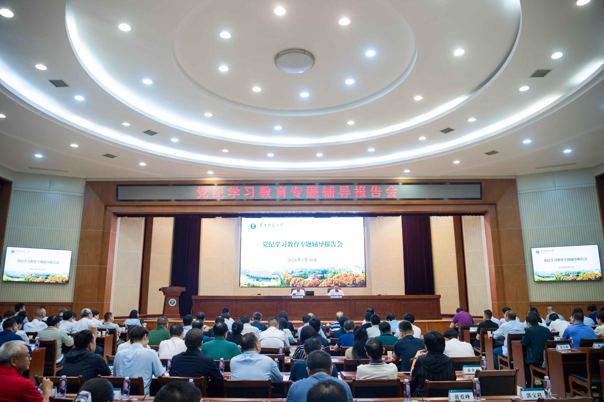 華大在線訊(通訊員 王濤)為深入學習貫徹《中國共產黨紀律處分條例》(以下簡稱《條例》),進一步加強全校黨員干部的黨性教育和紀律建設,推動黨紀學習教育走深走實,5月30日,學校黨委舉行黨紀學習教育專題輔導報告會,師生黨員“同上一堂黨紀課”。湖北省監(jiān)察委員會委員劉久遠應邀作專題輔導報告。校黨委書記夏立新主持報告會。