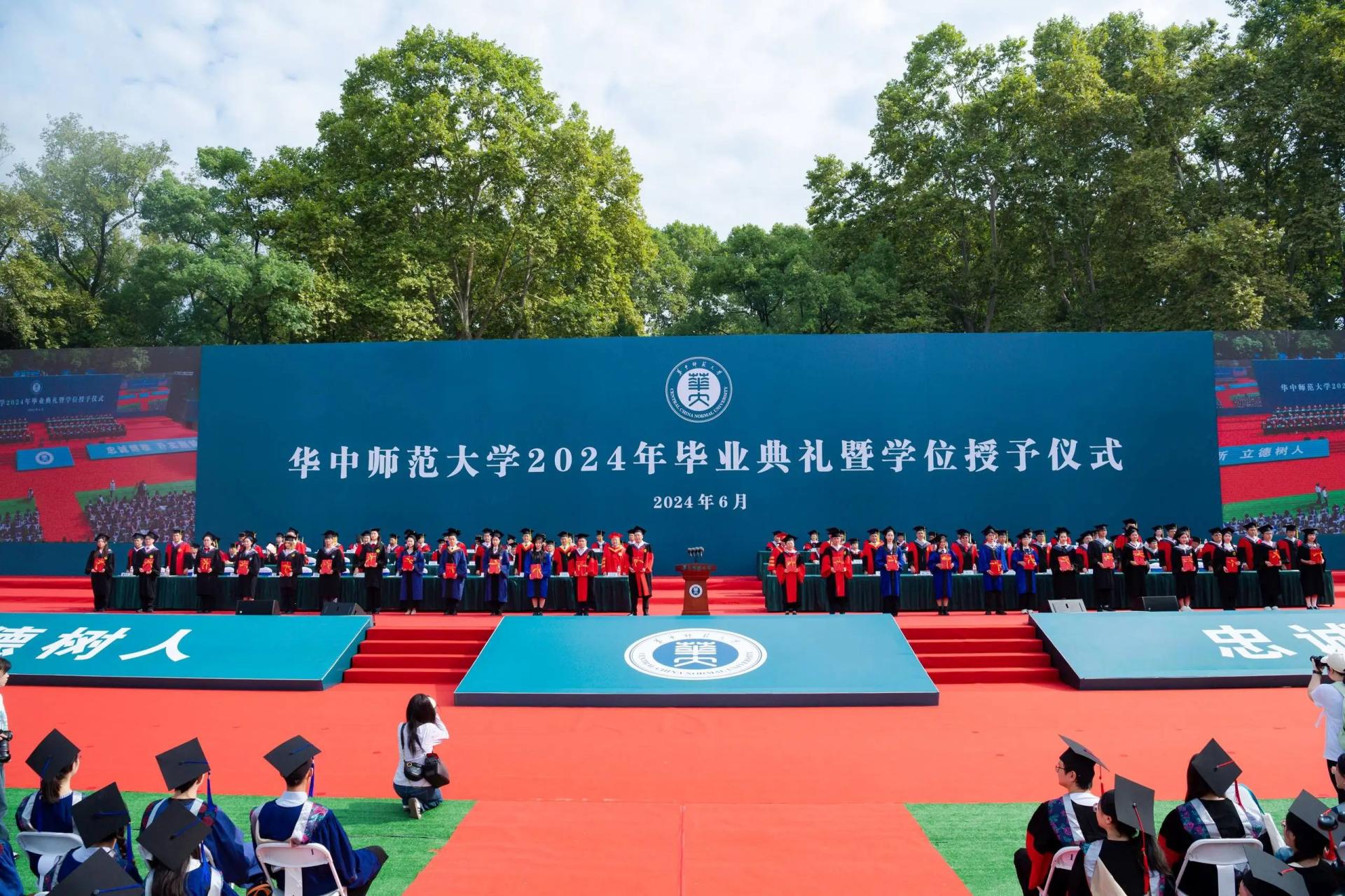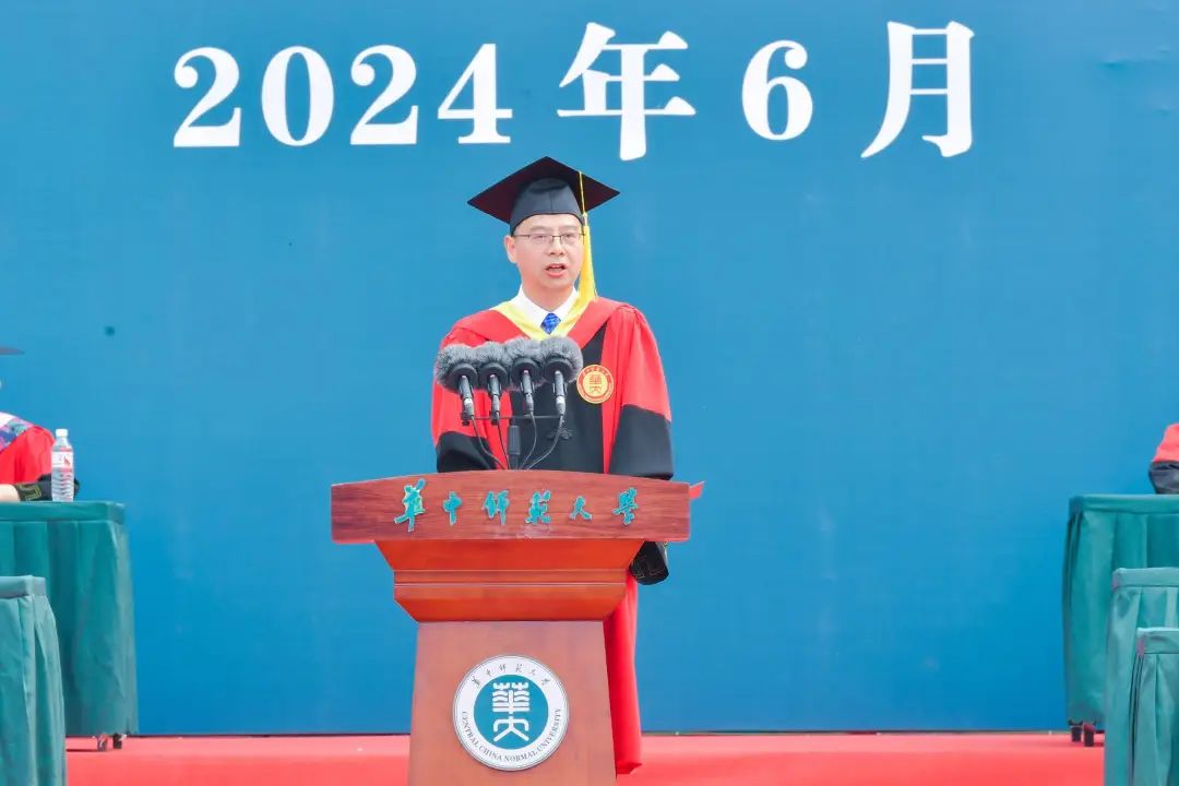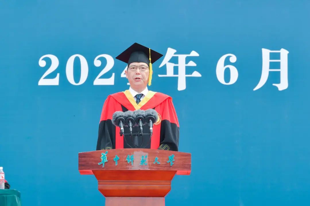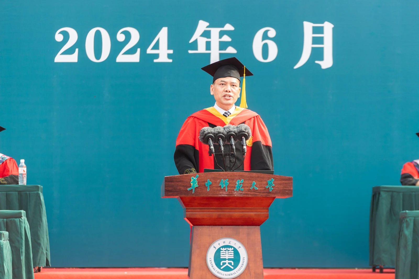 華大在線訊(通訊員 舒佳欣)6月18日,我校2024年畢業(yè)典禮暨學(xué)位授予儀式在佑銘體育場(chǎng)舉行。校黨委書記夏立新、校長彭雙階、校黨委副書記查道林、副校長彭南生,校黨委副書記、紀(jì)委書記劉繼文以及學(xué)校學(xué)術(shù)委員會(huì)代表、教師代表、校友代表、各職能部門和學(xué)院負(fù)責(zé)人出席,與家長代表共同見證8757名2024屆畢業(yè)生圓滿完成學(xué)業(yè),為同學(xué)們開啟未來的追光逐夢(mèng)之旅踐行。典禮由校黨委副書記陳迪明主持。