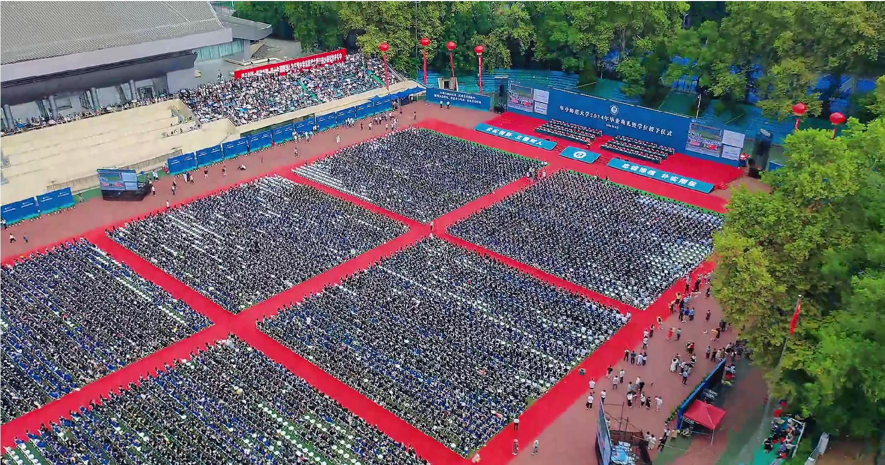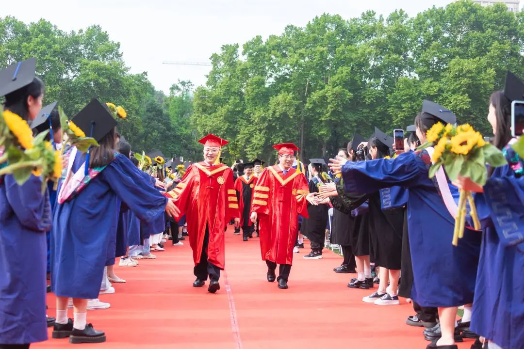熟悉的校歌回蕩在佑銘操場(chǎng)。來自各學(xué)院的80余位導(dǎo)師分列佑銘體育場(chǎng)兩側(cè),為所有畢業(yè)生一一撥穗,并頒發(fā)學(xué)位證書。