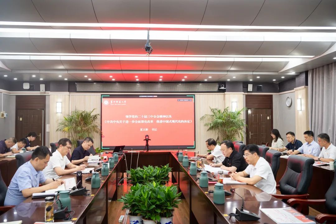 華大在線訊(記者 華軒)7月22日,校黨委理論學(xué)習(xí)中心組在行政樓一樓會議室開展2024年第9次集體學(xué)習(xí),深入學(xué)習(xí)貫徹黨的二十屆三中全會精神。校黨委常委參學(xué),相關(guān)職能部門負(fù)責(zé)人列席。校黨委書記夏立新主持學(xué)習(xí)。