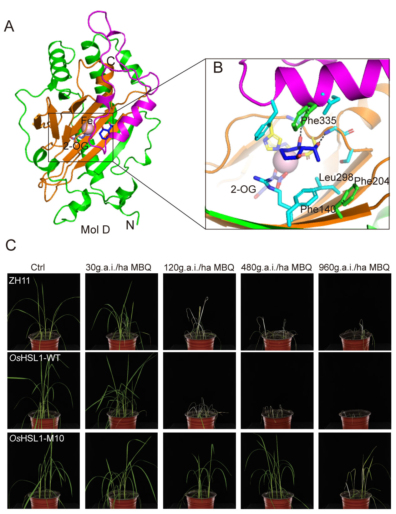 針對這一挑戰,研究團隊率先成功解析了HSL與HPPD除草劑的復合物晶體結構,揭示了HSL與底物的結合模式,發現了對催化反應起重要作用的4個氨基酸殘基。為提高HSL的催化效率,研究人員利用點突變產生了單重突變到四重突變的水稻HSL(OsHSL1)突變體M1-M10,并系統評估了它們對三酮類除草劑的催化活性,其中M10與HIS1的催化活性總體相當,但其催化降解甲基喹草酮(MBQ)的能力優于HIS1。為考察突變體實際應用價值,研究團隊以中花11為母本,構建了可穩定遺傳的抗除草劑轉基因水稻,并系統評價了其抗性水平。結果表明,表達OsHSL1-M10的品系對MBQ具有顯著抗性,相比表達OsHSL1-WT的品系,抗性水平提高了32倍,這為抗除草劑水稻育種提供了新基因,也為MBQ應用防控雜草稻等稻田惡性雜草奠定了基礎。