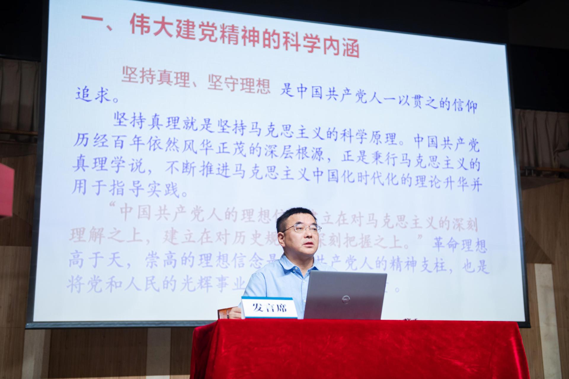 副校長劉宏達從中共一大代表陳潭秋、李漢俊、劉仁靜的故事講起,講述了我校的紅色人物、紅色歷史和紅色文化。劉宏達表示,希望借助此次示范宣講的契機,將紅色資源作為堅定理想信念、加強黨性修養的生動教材,教育引導廣大黨員干部永葆初心、勇擔使命,深入學習宣傳貫徹黨的二十屆三中全會精神和全國教育大會精神,全面推動中國共產黨人精神譜系的宣傳教育融入黨的建設和思想政治工作,貫穿教育教學全過程,使紅色基因能夠在師生中代代相傳,讓革命理想之花在學校永遠綻放。
