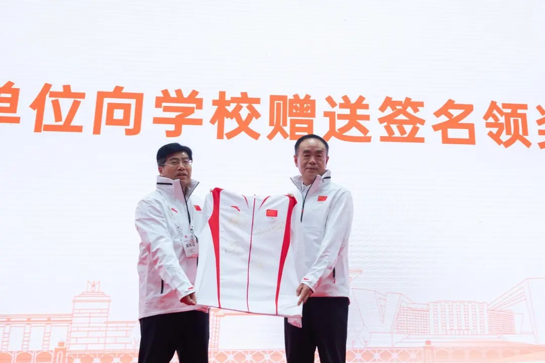 于建勇代表國家體育總局裝備中心向學校贈送運動員簽名的2024年巴黎奧運會中國體育代表團領獎服