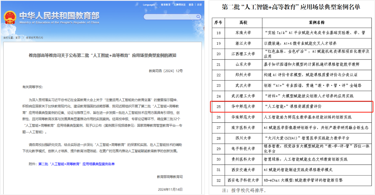 2024年6月,為深入貫徹落實習近平總書記在全國教育大會上關于“注重運用人工智能助力教育變革”的重要指示精神,積極響應國家關于加快教育現代化、建設教育強國的戰略部署,教育部高等教育司組織開展了第二批“人工智能+高等教育”典型應用場景案例的征集和論證工作,發掘在人工智能技術應用方面具有引領性、創新性,且對高等教育改革與發展具有顯著推動作用的實踐案例。自此次案例征集啟動以來,我校積極響應,信息化辦公室迅速開展校內遴選工作,并推選優秀案例參加。經過教育部專家論證,最終確定第二批 “人工智能+高等教育”應用場景典型案例名單。