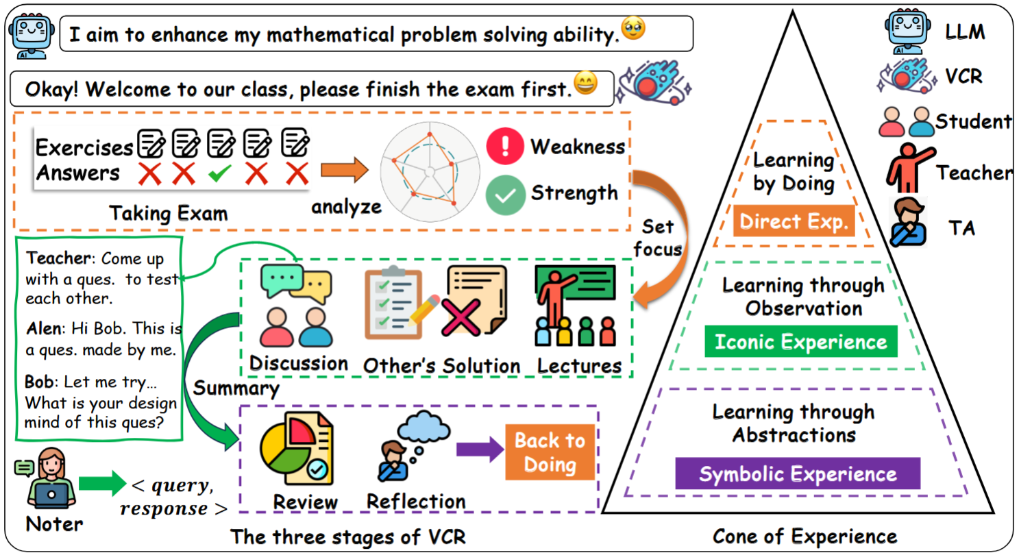 研究成果“VCR: A ‘Cone of Experience’ Driven Synthetic Data Generation Framework for Mathematical Reasoning”被人工智能國際頂級會議AAAI《The 39th Annual AAAI Conference on Artificial Intelligence》正式接收錄用。大語言模型在自然語言處理方面性能出色,但面對數學推理往往存在較大挑戰。隨著訓練模式的逐漸固化,學術界提出以數據為中心的人工智能思想,強調開發更高質量的數據以增強大語言模型性能?,F有研究擴展數據集構建面向數學推理的合成數據,進而監督微調大語言模型。這類方法大多關注數量而忽視質量,具有挑戰性的樣本在數據合成過程中沒有得到充分的考慮,導致數據構建成本高、密度低、同質化嚴重。該成果提出了一種名為Virtual ClassRoom(VCR)的多智能體環境,利用大語言模型驅動多種智能體角色構建高質量、多元化的合成數據?;凇敖涷炛崩碚摚琕CR類比人類學習,在數據合成過程中引入三個層次的經驗,精心設計了用戶友好的指令集和角色扮演系統,使VCR能夠自主規劃合成數據的規模。該系統實現了包括講授、研討、問題設計、問題解決等多種教育場景的自主模擬。多個實驗表明VCR生成的合成數據具有更高的質量密度和泛化能力,能夠以較小的訓練代價提高大語言模型的數學推理性能。