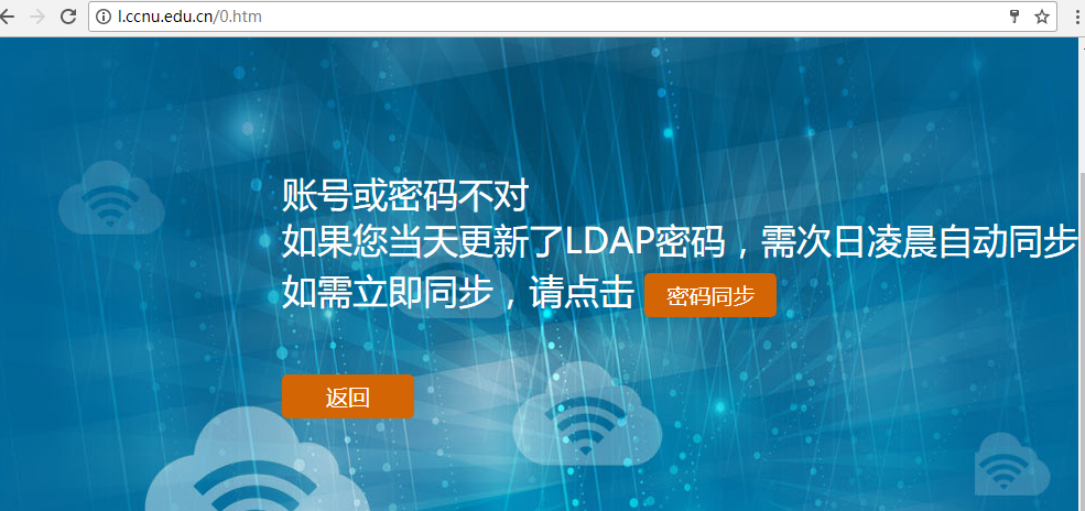 上網登錄認證提示“賬號或密碼不對”時,下圖(圖4)所示,可點擊“密碼同步”按鈕,觸發立即同步,然后重新登錄認證。