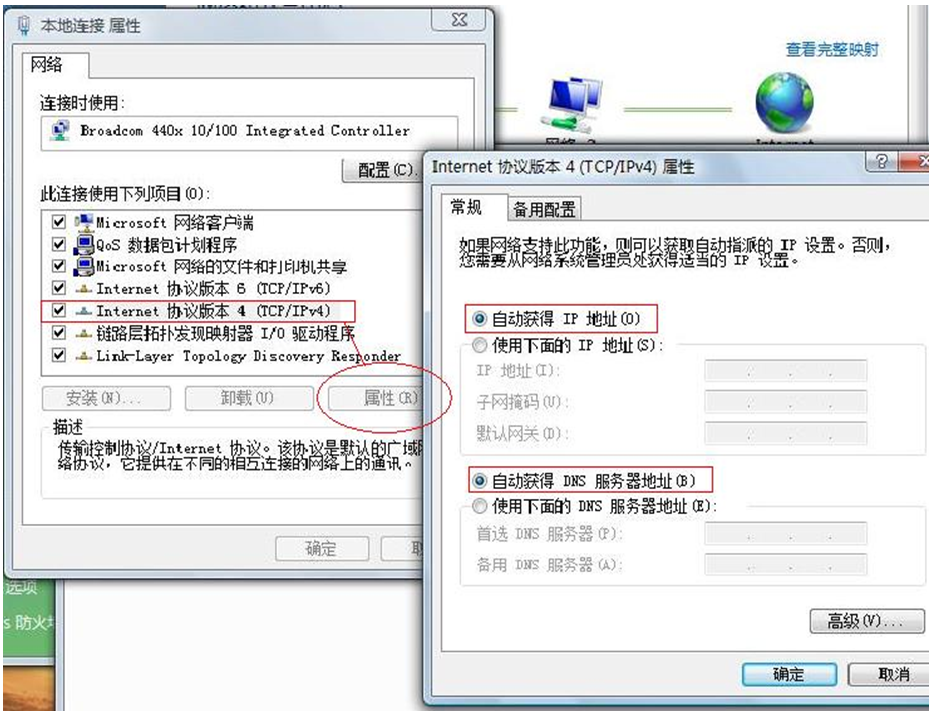在控制面板的網絡設置選項下,找到“本地連接”的“Internet協議版本4(TCP/IPv4)”,打開“屬性”設置,選擇“自動獲得IP地址和DNS服務器地址”,如下圖(圖1)所示: