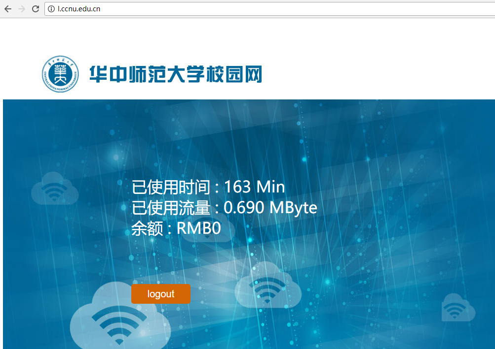 登錄認證成功后即可正常上網如下圖(圖3)所示,會顯示網絡使用情況和注銷退出功能。如不在使用網絡,點擊logout按鈕注銷。若圖3所示的頁面被關閉,可手動輸入l.ccnu.edu.cn。