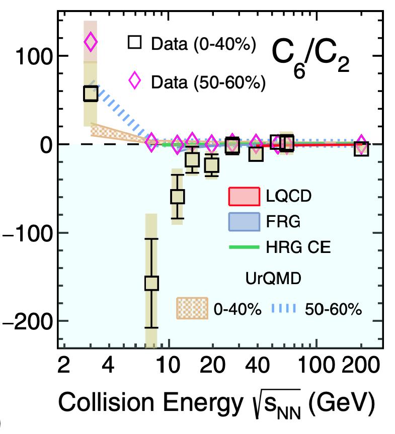 該實(shí)驗(yàn)研究分析了高能重離子對(duì)撞機(jī)自2010年起近十年采集的海量的實(shí)驗(yàn)數(shù)據(jù),對(duì)凈質(zhì)子數(shù)分布的高階累積矩進(jìn)行測量。實(shí)驗(yàn)測量發(fā)現(xiàn),0-40%中心碰撞的六階累積矩(C6/C2)隨著碰撞能量的降低逐漸變?yōu)樨?fù)值,但在最低碰撞能量3 GeV時(shí)變?yōu)檎怠?shí)驗(yàn)觀測到的負(fù)的六階累積矩以及各階次的層級(jí)(hierarchy)現(xiàn)象與從第一性原理出發(fā)的格點(diǎn)QCD的計(jì)算結(jié)果相符合,揭示出高能核碰撞中熱化夸克膠子等離子體已經(jīng)形成且強(qiáng)子相和夸克物質(zhì)相為平滑穿越。最低能量與高能量在測量值和符號(hào)都顯示出明顯差異,意味著熱密核物質(zhì)狀態(tài)方程發(fā)生了明顯的改變,3-20 GeV將是第二階段能量掃描搜尋QCD相變臨界點(diǎn)的重點(diǎn)能區(qū)。
