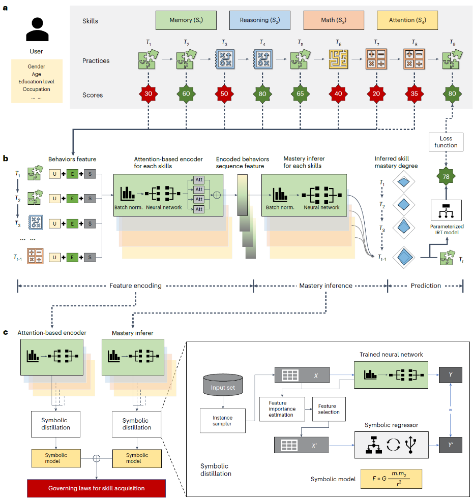 華大在線訊(通訊員 孫建文)近日,人工智能教育學部劉三女牙教授團隊取得階段性研究進展,提出了一種新穎的學習規律挖掘方法,能夠從自然發生的大規模行為數據中揭示認知技能習得的規律,為教育科學研究提供了一種高效的、更具潛力的研究工具。相關成果“Automated discovery of symbolic laws governing skill acquisition from naturally occurring data”在Nature子刊《自然-計算科學》(Nature Computational Science)在線發表。