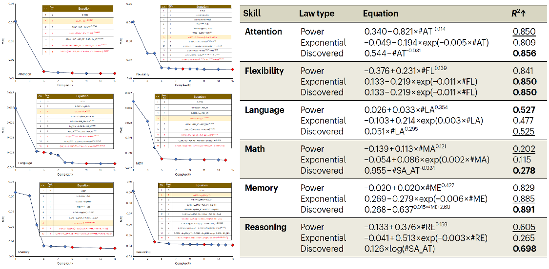 模擬實驗結果表明,該方法能夠在一定噪聲范圍內準確識別核心變量并重建預設的技能習得規律方程,驗證了所提方法的有效性。在大規模真實認知技能訓練數據的應用中,通過該方法發現的技能習得規律在適應度、擬合度等指標上顯著優于傳統和當前主流學習模型。同時,通過該方法從數據中發現了兩類新的認知技能習得規律(對數率與反冪率),并驗證了多項先前的研究發現。