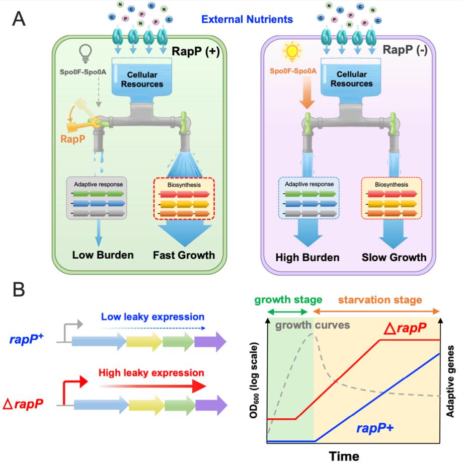 在這項最近的研究中,該團隊對枯草芽孢桿菌的生長生理特性進行了全面研究,發現與廣泛使用的枯草芽孢桿菌168菌株相比,祖先菌株(ancestralstrain)NCIB3610菌株在眾多碳源中的生長速率都要顯著高于168菌株。進一步分析表明祖先菌株攜帶的內生質粒pBS32中帶有一個編碼磷酸酶的rapP基因。RapP磷酸酶在指數生長期可以有效阻斷Spo0F-Spo0A逆境響應途徑的滲漏表達,降低細菌在逆境響應途徑中的無用消耗,幫助細菌最大化生長速率(圖A:雙閥水龍頭模型)。另一方面,當細菌進入營養饑餓狀態時,RapP的存在使得祖先菌株可以急劇快速地激活逆境響應途徑,進入環境適應模式(圖B)。因此RapP通路通過精準的適時調控(Just-in-time regulation)幫助細菌實現了在生長調控與環境適應的優化統籌調控,成功破解“魚與熊掌不可兼得”的權衡難題。