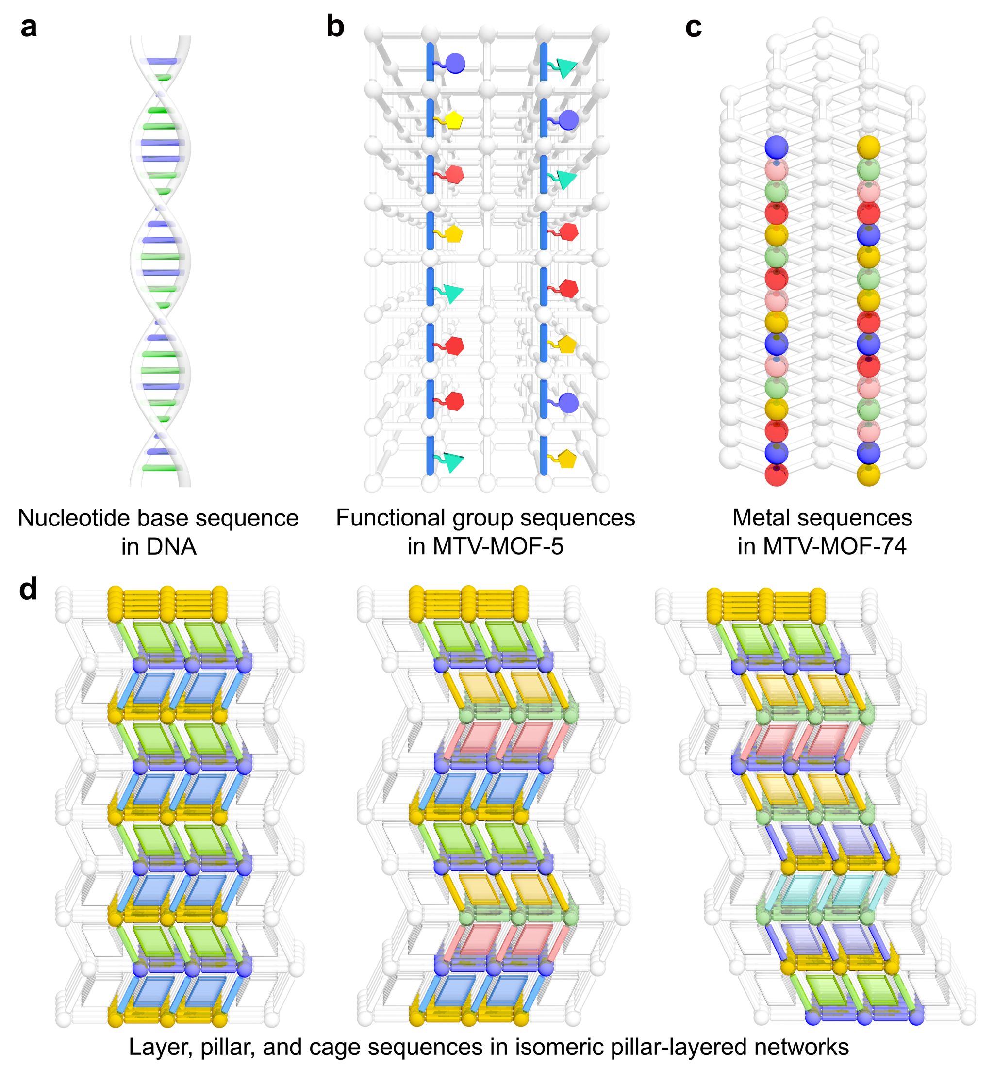 金屬有機(jī)框架材料(MOFs)具有模塊化的組裝模式和高度有序、明確的晶體結(jié)構(gòu),是有望實(shí)現(xiàn)精準(zhǔn)序列調(diào)控的合成材料之一。基于此,涂斌斌副教授團(tuán)隊(duì)首先在框架化學(xué)結(jié)構(gòu)數(shù)據(jù)庫(kù)(Reticular Chemistry Structure Resource)中篩選出同分異構(gòu)的層柱狀muo,umt 和toz拓?fù)淇蚣埽鋵咏M成相同,但呈現(xiàn)出不同的排列方式,形成了多樣化的層序列,即結(jié)構(gòu)的“基因”。同時(shí),插入層之間的柱子會(huì)形成具有方向性的不同Z字形柱序列。此外,不同框架中的層和柱序列組合產(chǎn)生了方向性明確的多樣化孔序列。進(jìn)而通過(guò)深入的解構(gòu)分析,揭示了上述框架的構(gòu)筑規(guī)律,并將其編成代碼,借助Python成功地預(yù)測(cè)了近2000種序列可調(diào)且具備原子級(jí)精準(zhǔn)性的框架,且極大地豐富了框架化學(xué)結(jié)構(gòu)數(shù)據(jù)庫(kù)。