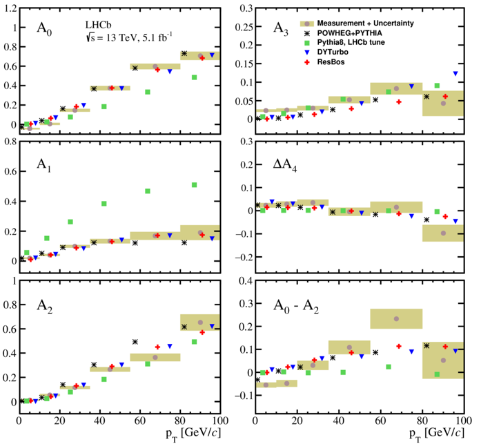 圖1.對Z玻色子極化參數的測量結果(黃色帶子)和不同理論預言(彩色點)的對比